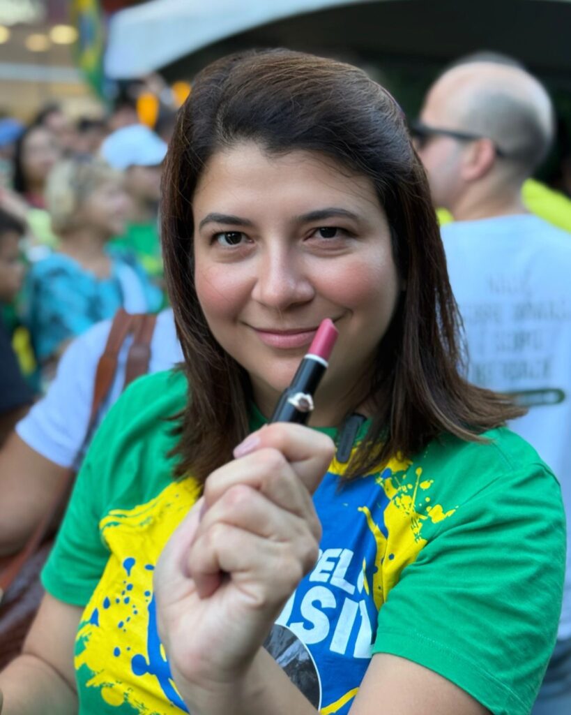 Segurando um batom — em referência ao caso de Débora Rodrigues, presa após escrever “Perdeu, mané” com batom em frente ao STF — a deputada ironizou: “Cuidado que eu vim armada. Estou com um batom e deixei minha outra arma, a Bíblia, no carro.