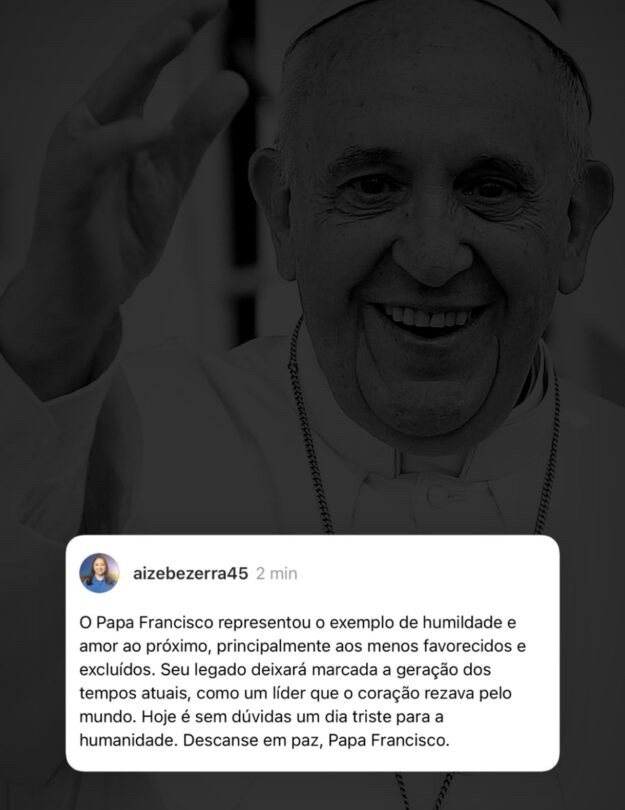 “O Papa Francisco representou o exemplo de humildade e amor ao próximo, principalmente aos menos favorecidos e excluídos. Seu legado deixará marcada a geração dos tempos atuais, como um líder cujo coração rezava pelo mundo. Hoje é, sem dúvidas, um dia triste para a humanidade. Descanse em paz, Papa Francisco”, escreveu Aize.