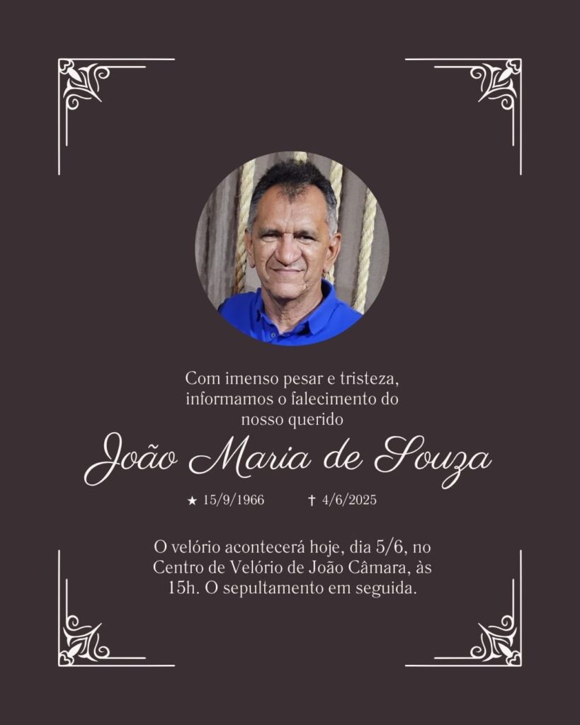 A família do querido professor João Maria de Souza comunica com profundo pesar o seu falecimento e informa que o velório será realizado hoje, dia 5 de junho, a partir das 15h, no Centro de Velório de João Câmara. O sepultamento ocorrerá em seguida, no mesmo dia.