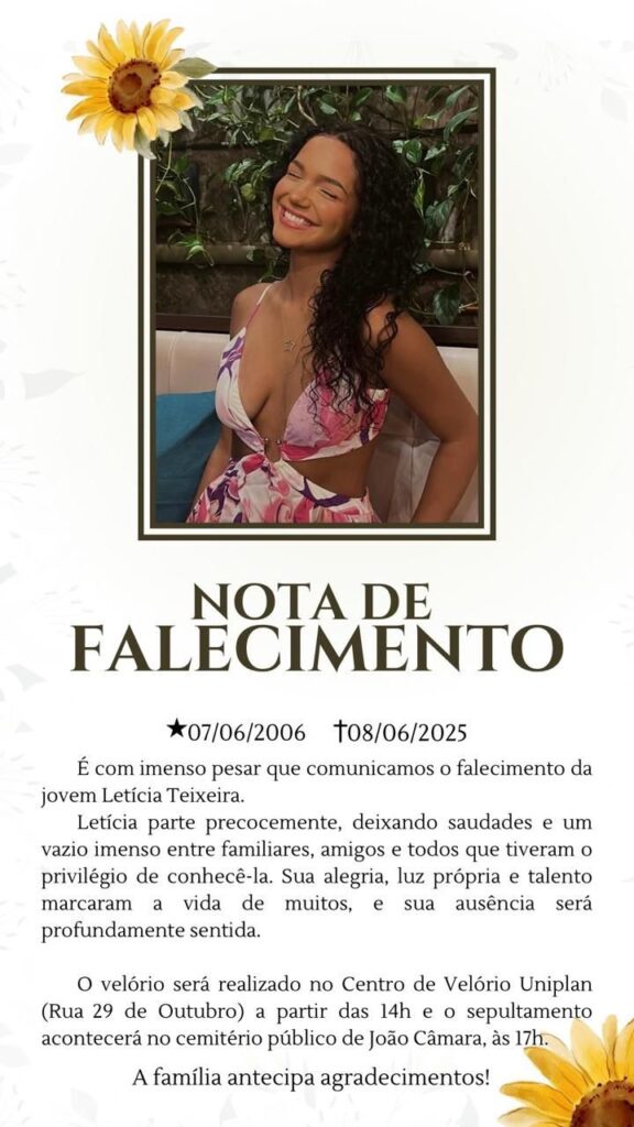 É com imensa tristeza que comunicamos o falecimento de Letícia Teixeira, uma alma radiante que partiu cedo demais, deixando um vazio impossível de preencher. Sua alegria contagiante, luz única e talento extraordinário tocaram todos que tiveram a honra de conhecê-la. Letícia será eternamente lembrada pelo amor que compartilhou e pelas marcas que deixou em nossos corações.