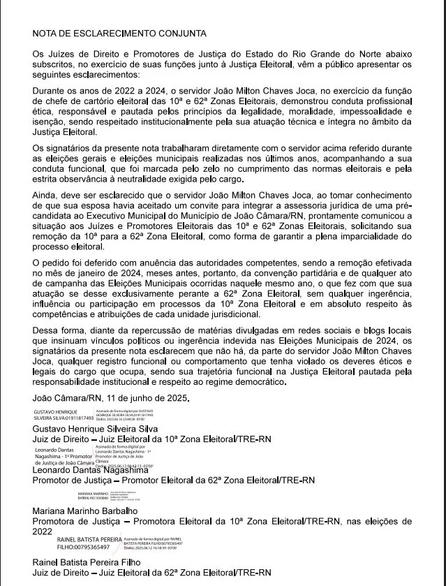 Em meio a especulações e insinuações veiculadas por blogs e redes sociais, juízes de direito e promotores de justiça do Rio Grande do Norte emitiram, no dia 11 de junho de 2025, uma nota conjunta em defesa da conduta profissional de João Milton Chaves Joca, chefe de cartório das 10ª e 62ª Zonas Eleitorais de João Câmara/RN.
