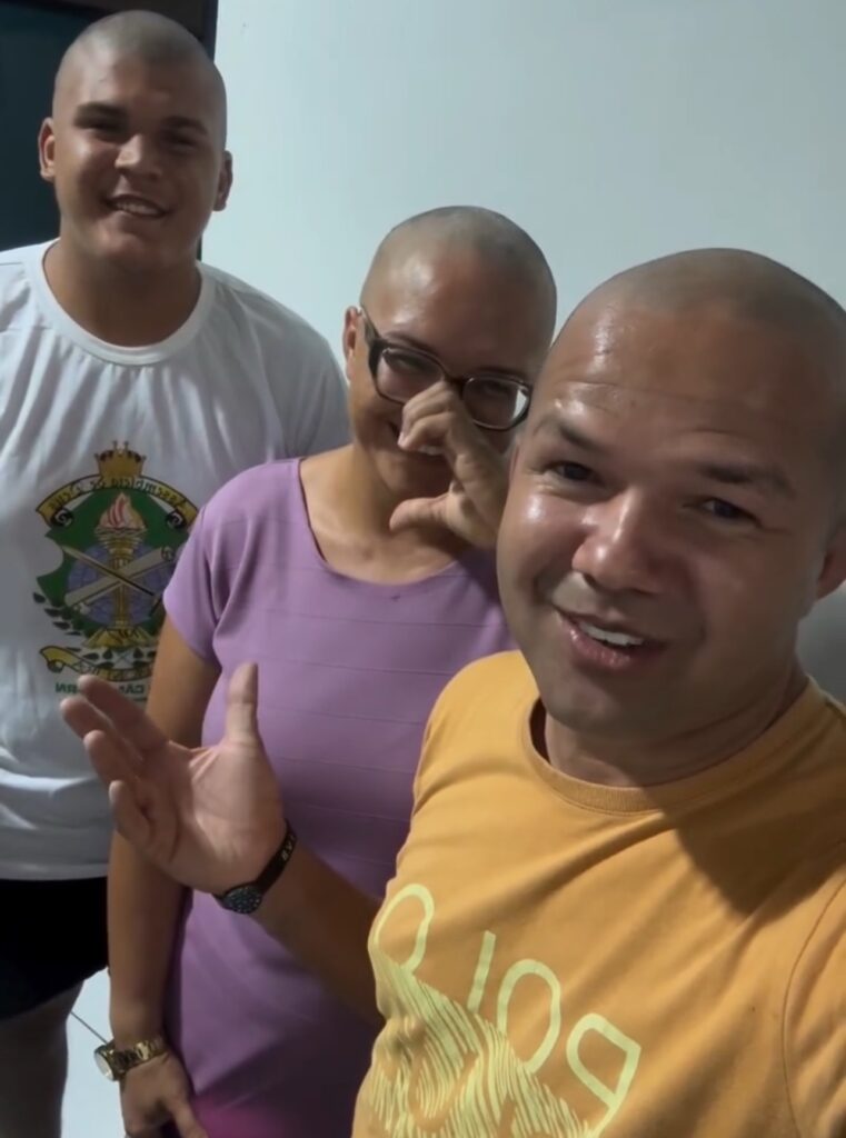 Em um gesto de amor e solidariedade, o empresário Edimar, conhecido no ramo de padarias em João Câmara/RN, viralizou nas redes sociais ao publicar um vídeo emocionante ao lado de sua irmã, Elisângela, e seu sobrinho, Paulinho, todos de cabeça raspada. A ação foi uma forma de apoio à irmã, que está passando por um delicado processo de tratamento de saúde, possivelmente radioterapia.