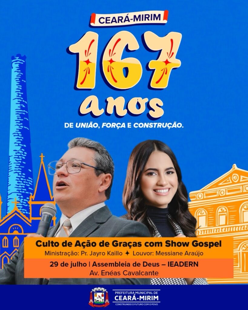 Nesta terça-feira, 29 de julho, a cidade de Ceará-Mirim, na Grande Natal, celebra seu aniversário de 167 anos com uma programação especial que inclui um momento de comunhão e adoração voltado para a comunidade evangélica local.