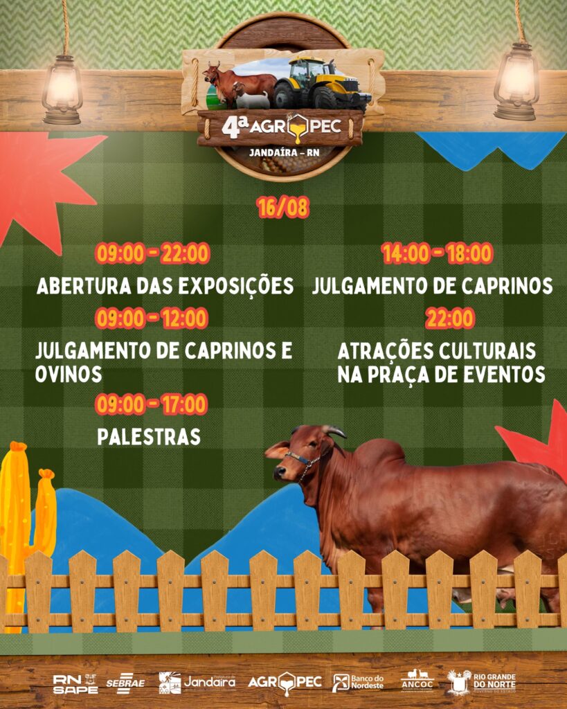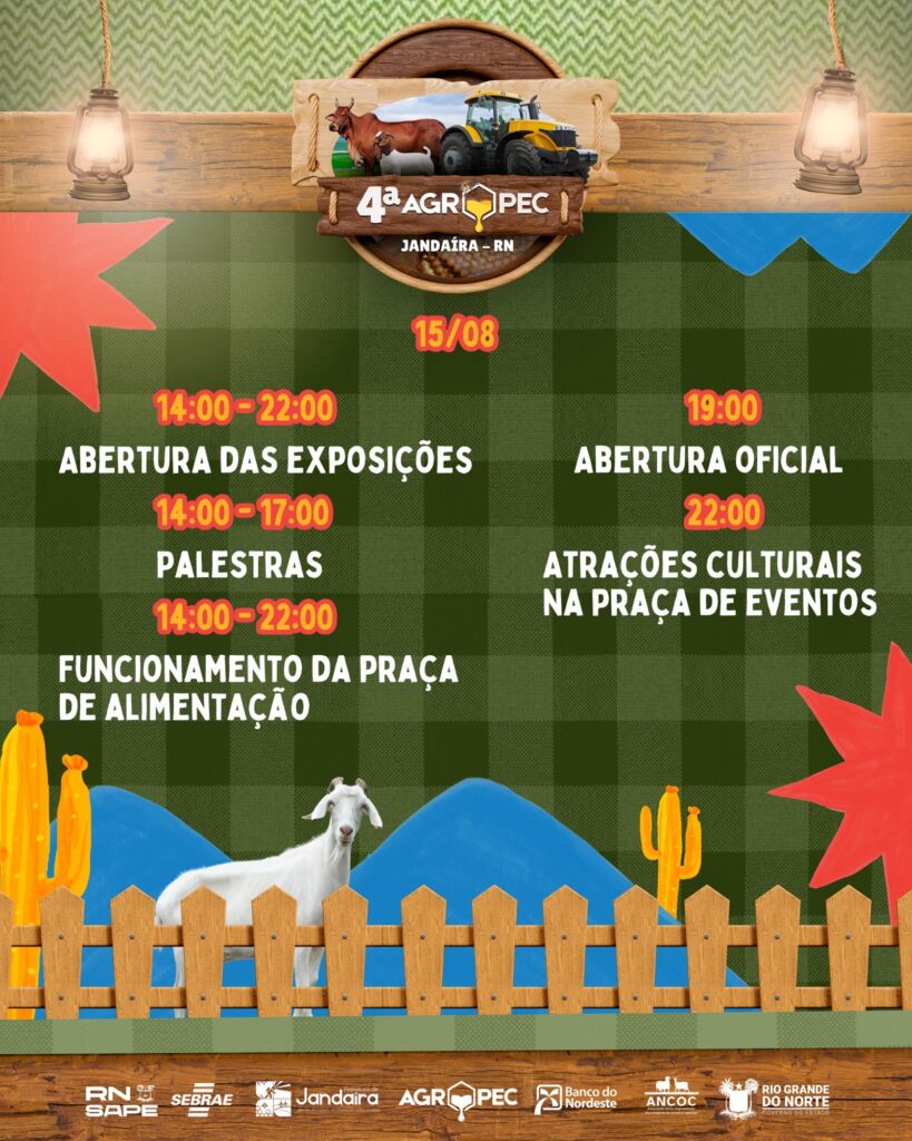 Nos dias 15 e 16 de agosto de 2025, a cidade de Jandaíra, localizada na região do Mato Grande (RN), será palco da 4ª edição da Agropec, a maior feira de agricultura e pecuária do território. O evento promete movimentar toda a região com uma programação que mistura negócios, tecnologia, cultura, gastronomia e entretenimento, reunindo produtores, expositores e visitantes de diversas partes do estado.