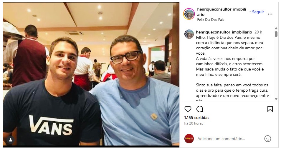 O consultor imobiliário, Henrique Cabral, pai do jovem que ficou conhecido nacionalmente como o “Bombado do elevador”, fez uma publicação em suas redes sociais neste último domingo (10), data em que se comemorou o Dia dos Pais.