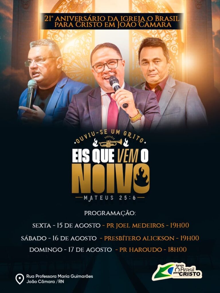 A Igreja Evangélica O Brasil para Cristo em João Câmara comemora seu 21º aniversário com três noites de celebração, nos dias 15, 16 e 17 de agosto (sexta a domingo). Sob o tema inspirado no livro bíblico de Mateus 25:6 – “À meia-noite, ouviu-se um clamor: Eis o noivo! Saí ao seu encontro!” –, o evento reunirá fiéis e convidados para momentos de reflexão e louvor.