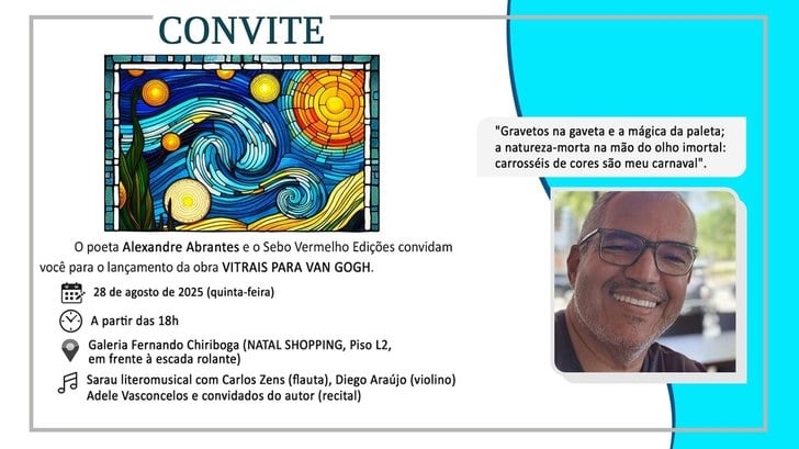 O poeta potiguar Alexandre Abrantes, servidor do Tribunal Regional Eleitoral do Rio Grande do Norte (TRE-RN), lança nesta quinta-feira (28), às 18h, o livro Vitrais para Van Gogh, sua quarta obra publicada e o terceiro título de poesia. A sessão de autógrafos acontece na Galeria Fernando Chiriboga, no piso L2 do Natal Shopping, e contará com programação cultural.