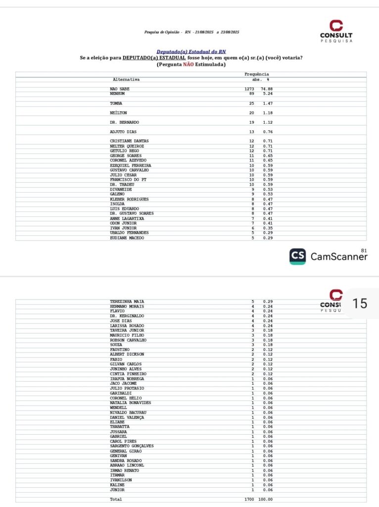 A pesquisa do Instituto Consult, divulgada nesta terça-feira pelo jornal Tribuna do Norte, mostra o cenário atual da eleição proporcional para deputado estadual e federal. A disputa para a Assembleia Legislativa é liderada pelo deputado estadual Tomba Farias, líder do PL na Assembleia Legislativa. O parlamentar obteve 1,47% das intenções de votos entre os 1.770 eleitores entrevistados. Em segundo lugar aparece o deputado Neilton Diógenes e Dr. Bernardo, na terceira posição.