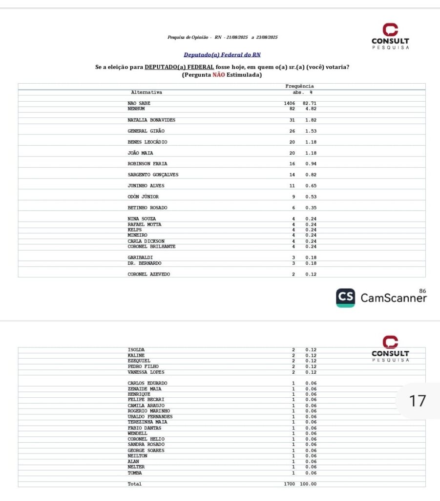 A corrida por uma vaga na Câmara Federal tem a deputada federal Natália Bonavides (PT) ocupando o primeiro lugar, de acordo com o levantamento estatístico realizado entre os dias 21 e 23 de agosto nas 12 regiões do estado. Em segundo lugar aparece o deputado federal entre General Girão, seguido por Benes Leocádio.
