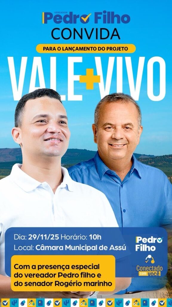 O Vale do Açu, no Rio Grande do Norte, pode se transformar em um modelo de desenvolvimento sustentável com a implementação do projeto Vale+Vivo. Iniciativa do mandato do vereador de Assu, Pedro Filho (PL), em parceria com o Instituto de Desenvolvimento Habitacional Canaã (IDEHAC), o projeto busca integrar agricultura sustentável, turismo e desenvolvimento social, formando uma base sólida para o crescimento regional equilibrado. A proposta será apresentada no próximo sábado (28), em evento que contará com a presença do senador e presidente estadual do PL, Rogério Marinho.