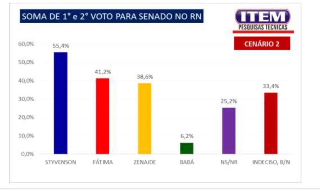 Já no cenário 2, Styvenson amplia a vantagem e atinge 55,4% das intenções de voto. Fátima Bezerra aparece com 41,2%, seguida por Zenaide Maia, com 38,6%. O nome de Babá, ex-prefeito de São Tomé e atual presidente da Federação dos Municípios do Estado do Rio Grande do Norte (Femurn), surge com 6,2%. Não sabe ou não respondeu soma 25,2%, e indecisos, branco e nulo chegam a 33,4%.