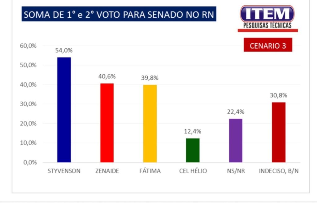 No cenário 3, Styvenson Valentim mantém a liderança, com 54%, seguido por Zenaide Maia, com 40,6%, e Fátima Bezerra, com 39,8%. Coronel Hélio, pré-candidato pelo PL, pontua com 12,4%. O percentual de não sabe ou não respondeu é de 22,4%, e indecisos, branco e nulo totalizam 30,8%.