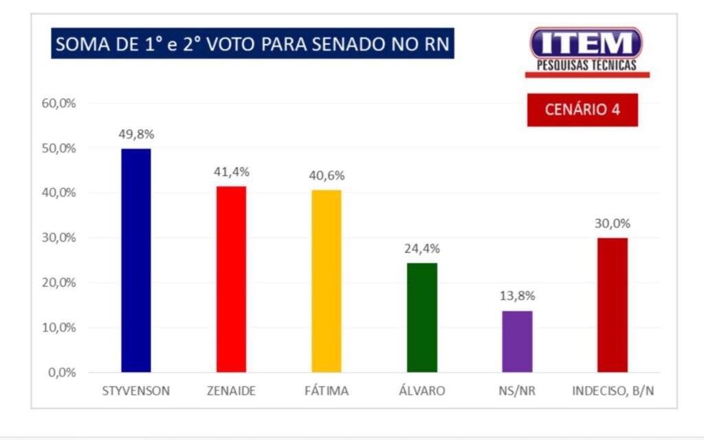 Por fim, no cenário 4, Styvenson registra 49,8%, com Zenaide Maia alcançando 41,4% e Fátima Bezerra somando 40,6%. Nesse levantamento, surge o nome do ex-prefeito de Natal, Álvaro Dias, que aparece com 24,4%. O índice de não sabe ou não respondeu é de 13,8%, enquanto indecisos, votos brancos e nulos somam 30%.