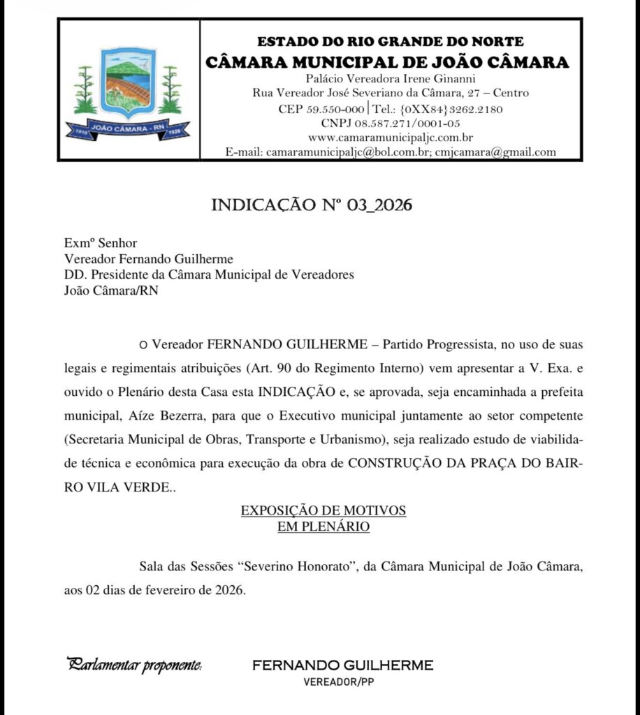A Indicação nº 03/26, de autoria do vereador, foi encaminhada à prefeita municipal, Aíze Bezerra. O documento solicita que o Poder Executivo, por meio da Secretaria Municipal de Obras, Transporte e Urbanismo, realize um estudo de viabilidade técnica e econômica para a execução da obra de construção da Praça do Bairro Vila Verde.