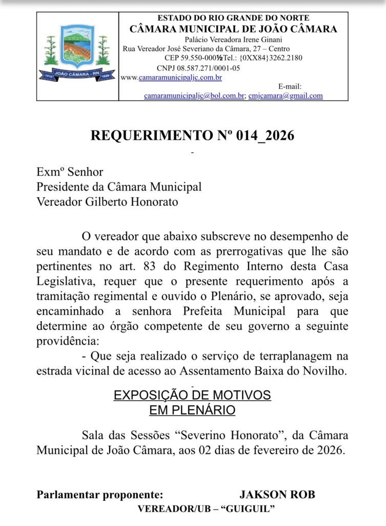 Na sessão ordinária realizada da Câmara Municipal de João Câmara/RN, o vereador Guiguil (UB), protocolou mais um requerimento em benefício da zona rural do município. A propositura de nº 14/26 foi encaminhada à prefeita municipal solicitando que, através do órgão competente, seja realizado o serviço de terraplanagem na estrada vicinal de acesso ao Assentamento Baixa do Novilho.
