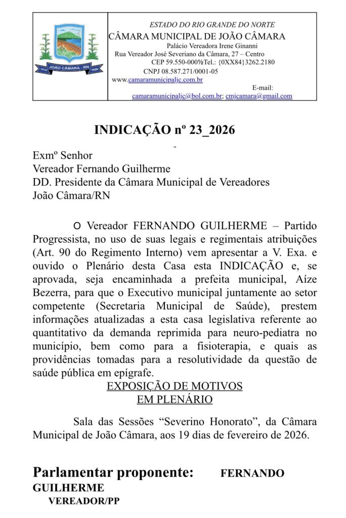 Durante sessão ordinária realizada na tarde desta quinta-feira (19) na Câmara Municipal de João Câmara/RN, o vereador Fernando Guilherme apresentou a Indicação nº 23/26, encaminhada ao Executivo.