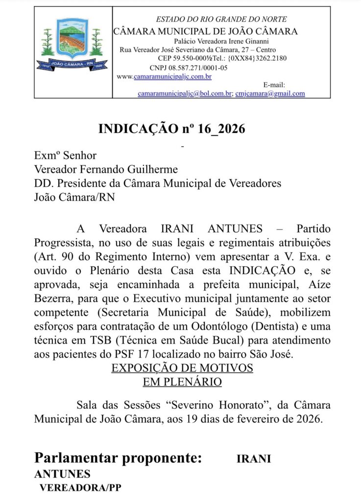 Em João Câmara, durante a sessão ordinária desta quinta-feira (19) de fevereiro, a vereadora Irani Antunes apresentou o Projeto de Indicação n° 16/2026 solicitando que o Executivo Municipal, juntamente com a Secretaria Municipal de Saúde, mobilize esforços para a contratação de um odontólogo (dentista) e de uma Técnica em Saúde Bucal (TSB) para atender os pacientes do PSF 17, localizado no bairro São José.