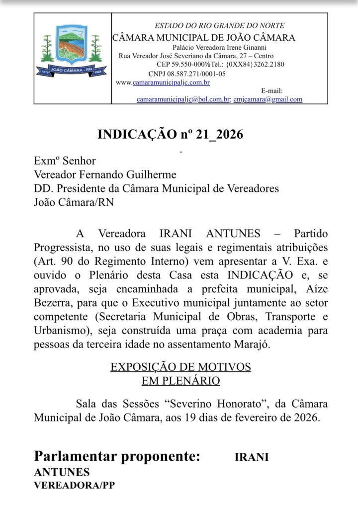 A vereadora Irani Antunes teve mais uma importante iniciativa aprovada na Câmara Municipal de João Câmara. Durante a sessão da última quinta-feira (19), a parlamentar apresentou a Indicação n° 21/2026, solicitando a construção de uma praça com academia voltada para pessoas da terceira idade no Assentamento Marajó.