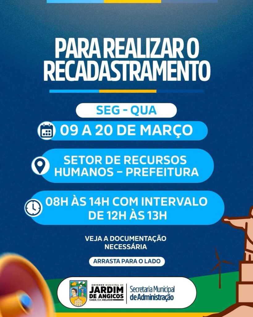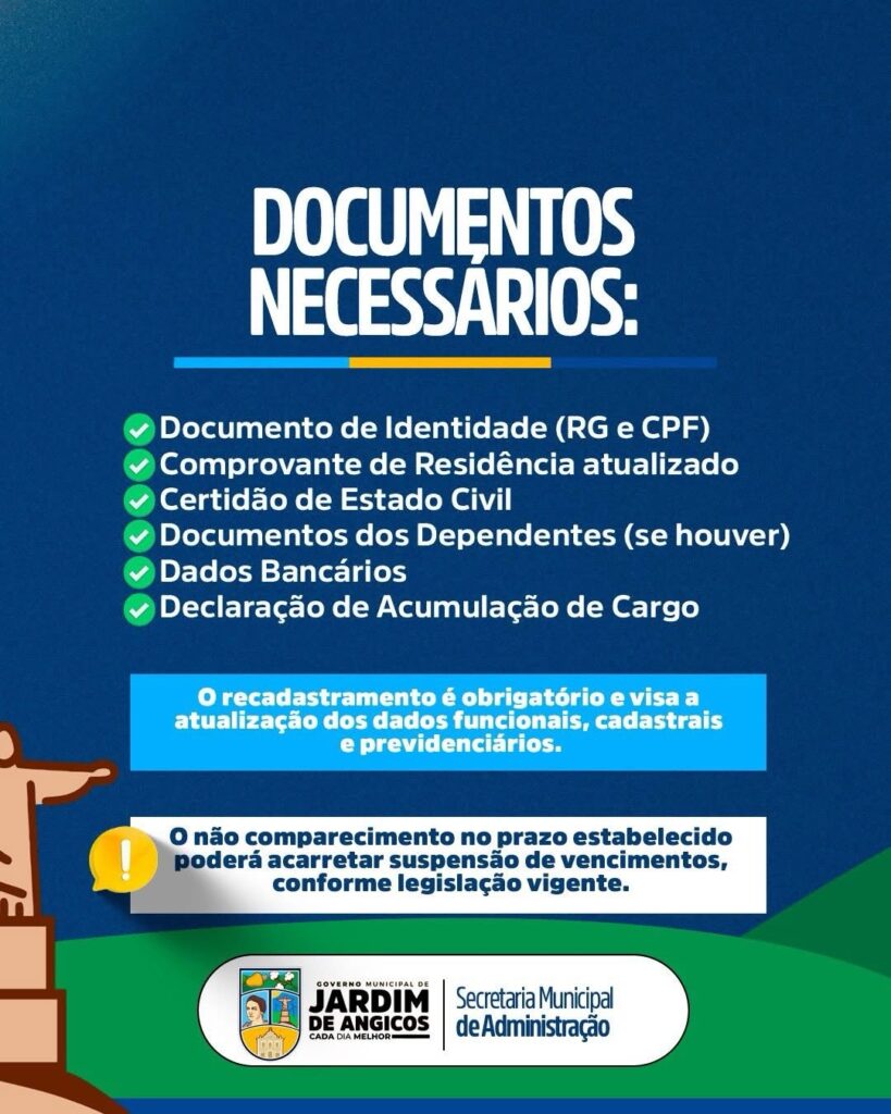 A Prefeitura Municipal de Jardim de Angicos está convocando todos os servidores efetivos do município para realizarem o recadastramento funcional. A atualização dos dados é obrigatória e deve ser feita presencialmente.