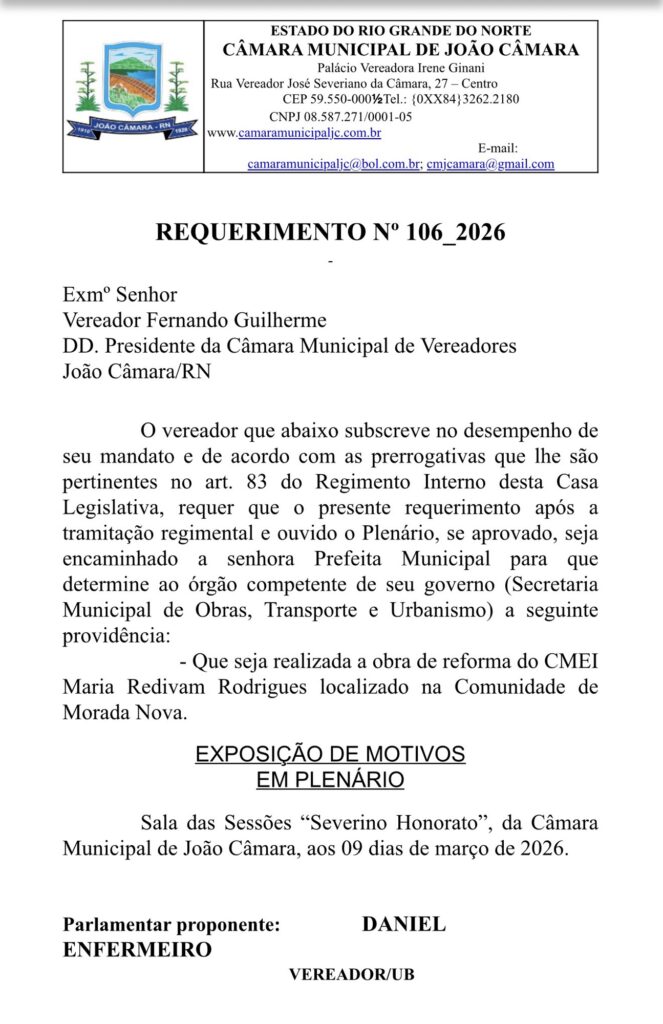 Já o Requerimento nº 106/26 pede que o Executivo Municipal, por meio da mesma secretaria competente, realize a reforma do CMEI Maria Redivam Rodrigues, também localizado na comunidade de Morada Nova, com o objetivo de melhorar a estrutura e oferecer mais qualidade no atendimento às crianças da localidade.👇