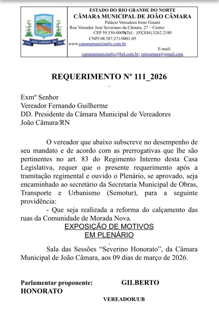 Já o Requerimento nº 111/26 também foi direcionado à SEMOTUR e solicita a realização da reforma do calçamento das ruas da comunidade de Morada Nova. A iniciativa busca garantir mais segurança e mobilidade para a população, além de contribuir com a valorização da comunidade.