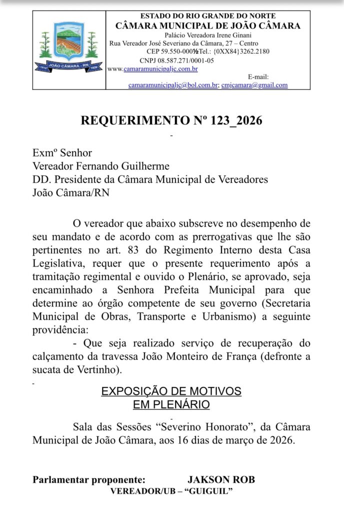 Já o segundo requerimento pede a execução de serviço de recuperação do calçamento da Travessa João Monteiro de França, localizada em frente à sucata de Vertinho. A solicitação visa garantir melhores condições de mobilidade e segurança para os moradores da localidade.
