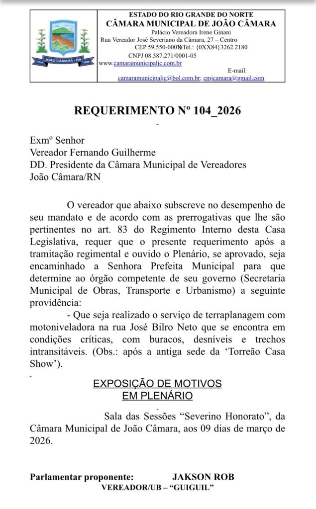 O primeiro requerimento solicita que seja encaminhado expediente à prefeita municipal, Aize Bezerra, para que determine à Secretaria Municipal de Obras, Transporte e Urbanismo a realização de serviço de terraplanagem com motoniveladora na Rua José Bilro Neto. De acordo com o parlamentar, a via se encontra em condições críticas, apresentando buracos, desníveis e trechos intransitáveis, especialmente após a antiga sede da Torreão Casa Show, dificultando o tráfego de veículos e pedestres.