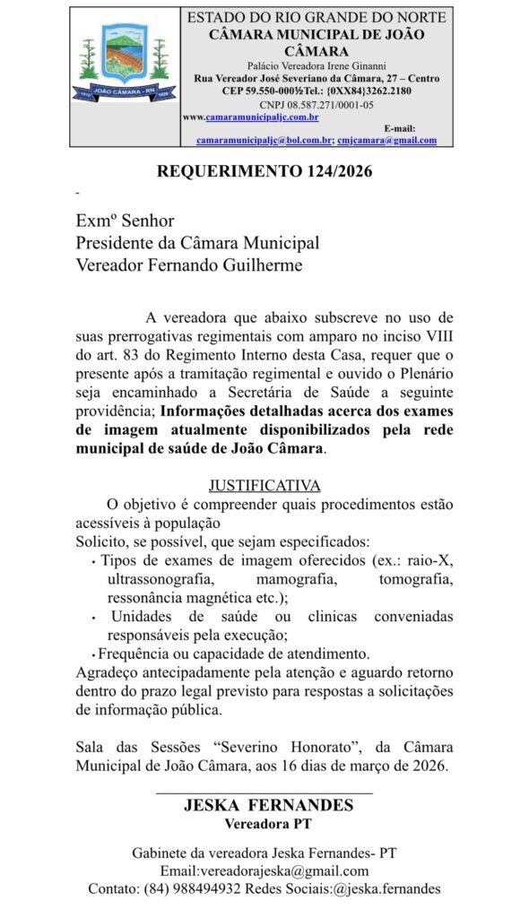Durante sessão ordinária realizada na Câmara Municipal de João Câmara/RN, a vereadora Jeska Fernandes teve dois importantes requerimentos aprovados por unanimidade pelos demais parlamentares, reforçando sua atuação em defesa da transparência e da melhoria dos serviços públicos no município.