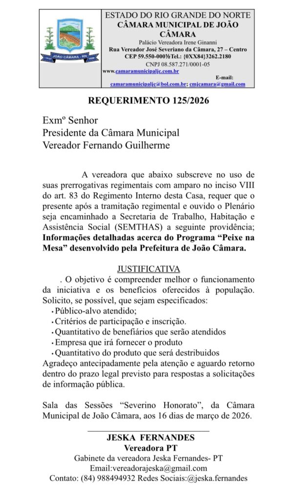 Já o Requerimento nº 125/26 é direcionado à Secretaria Municipal de Trabalho, Habitação e Assistência Social (SEMTHAS), solicitando informações detalhadas sobre o Programa “Peixe na Mesa”, desenvolvido pela Prefeitura de João Câmara.