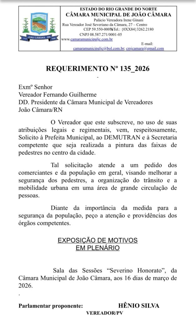 Na proposta (135/26), o parlamentar solicita à prefeita municipal, ao DEMUTRAN e à secretaria competente que seja realizada a pintura das faixas de pedestres no centro da cidade. A medida atende a uma demanda dos comerciantes e da população em geral, especialmente em uma área com grande fluxo de pessoas.