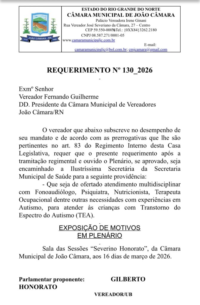O Requerimento n° 130/2026 solicita à Secretaria Municipal de Saúde a oferta de atendimento multidisciplinar especializado para crianças com Transtorno do Espectro do Autismo (TEA). A proposta prevê a disponibilização de profissionais como fonoaudiólogo, psiquiatra, nutricionista e terapeuta ocupacional, todos com experiência no atendimento a pessoas com autismo.