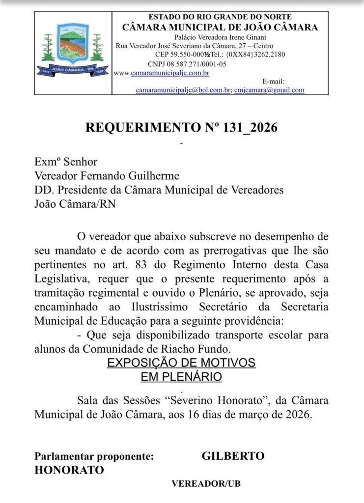 Já o Requerimento n° 131/2026 é direcionado à Secretaria Municipal de Educação e trata da disponibilização de transporte escolar para alunos da comunidade de Riacho Fundo. A medida visa assegurar o acesso regular dos estudantes às unidades de ensino, oferecendo mais segurança e condições adequadas para a frequência escolar.