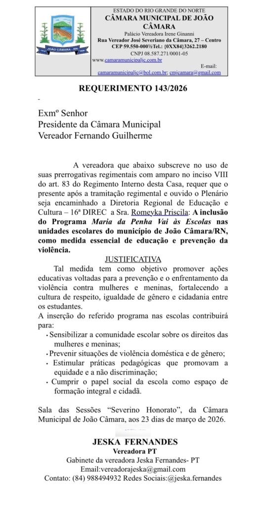 Durante sessão ordinária realizada na Câmara Municipal de João Câmara/RN, a vereadora Jeska Fernandes (PT) apresentou o requerimento de nº 143/26, solicitando que seja encaminhado à Diretoria Regional de Educação e Cultura – 16ª DIREC, na pessoa da senhora Romeyka Priscila, a inclusão do Programa Maria da Penha Vai às Escolas nas unidades escolares do município.