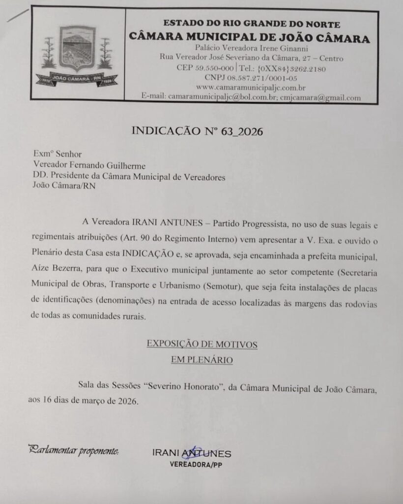 A parlamentar solicitou que, após aprovação em plenário, a proposta seja encaminhada à prefeita municipal, Aize Bezerra, para que o Poder Executivo, por meio da Secretaria Municipal de Obras, Transporte e Urbanismo (SEMOTUR), adote as providências necessárias para a instalação de placas de identificação nas entradas de acesso às comunidades rurais, especialmente aquelas situadas às margens das rodovias.