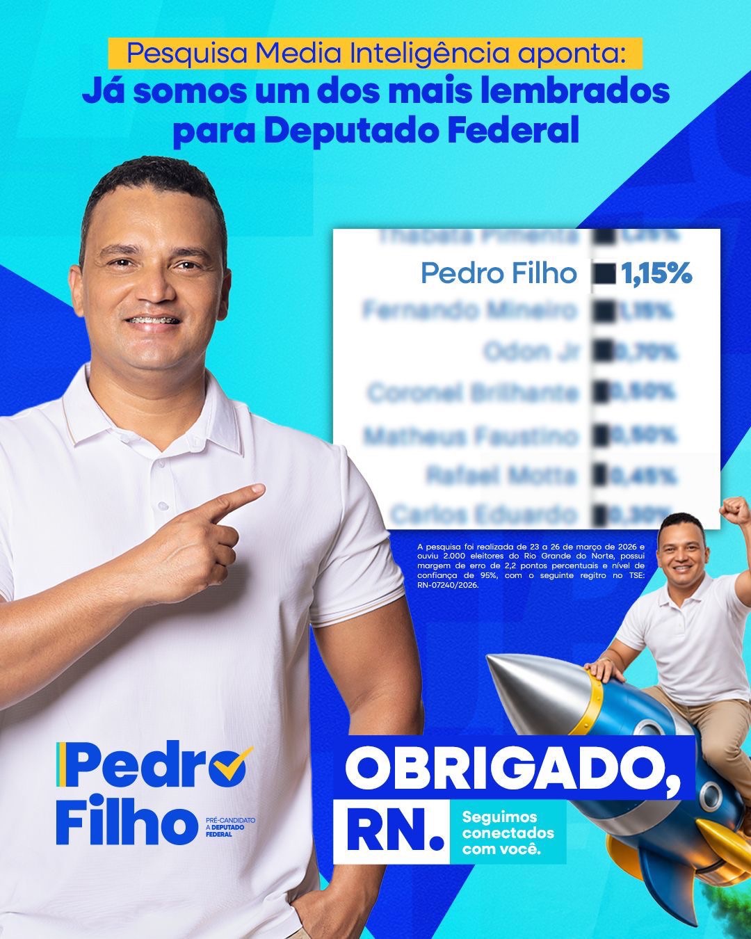 Único nome do Vale do Açu a disputar uma vaga na Câmara dos Deputados, Pedro Filho aparece entre os mais citados na pesquisa. Vereador de Assú e líder evangélico, Pedro Filho tem de destacado na nominata do PL, sendo apontado como uma das prováveis surpresas no pleito que se aproxima.
