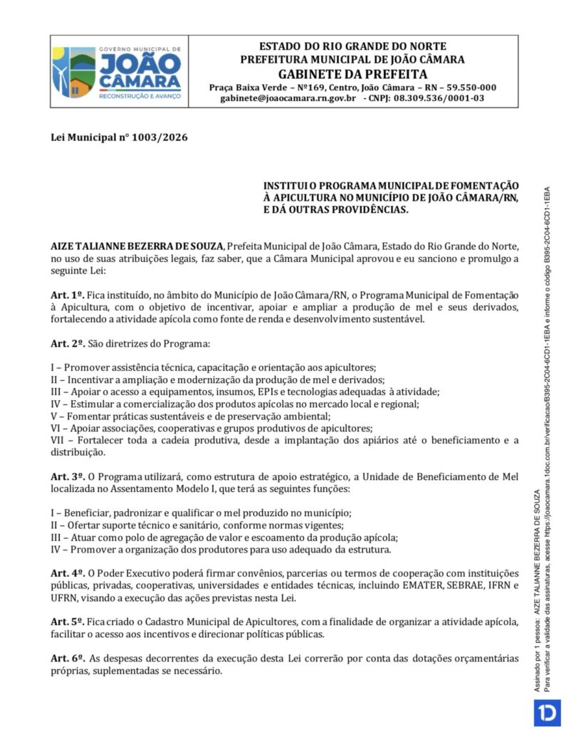 A prefeita de João Câmara/RN, Aize Bezerra, sancionou a Lei nº 1003/2006, de autoria do vereador Hênio Silva, que institui o Programa Municipal de Fomento à Apicultura no município.
