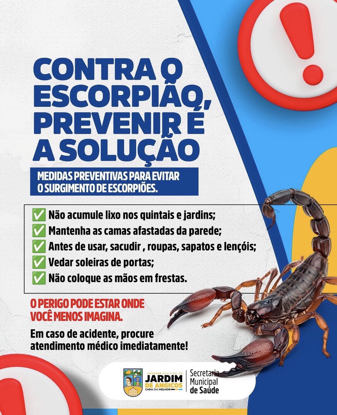 Diante da situação, a gestão municipal orienta que a população adote medidas simples, porém eficazes, para evitar a presença desses animais nas residências e arredores. Entre as principais recomendações estão manter quintais e terrenos sempre limpos, sem acúmulo de entulhos, lixo ou restos de construção, além de evitar o acúmulo de folhas, madeiras e outros materiais que possam servir de abrigo para os escorpiões.