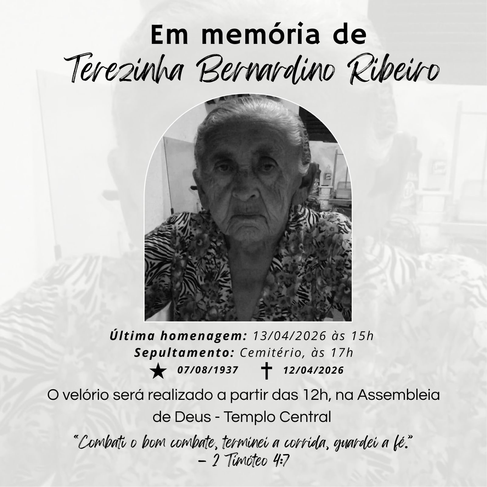 A Assembleia de Deus em João Câmara, pastoreada pelo pastor Supervisor Rogério Câmara, está de luto pelo falecimento da irmã Terezinha Bernardino Ribeiro, ocorrido nesta segunda-feira (13).