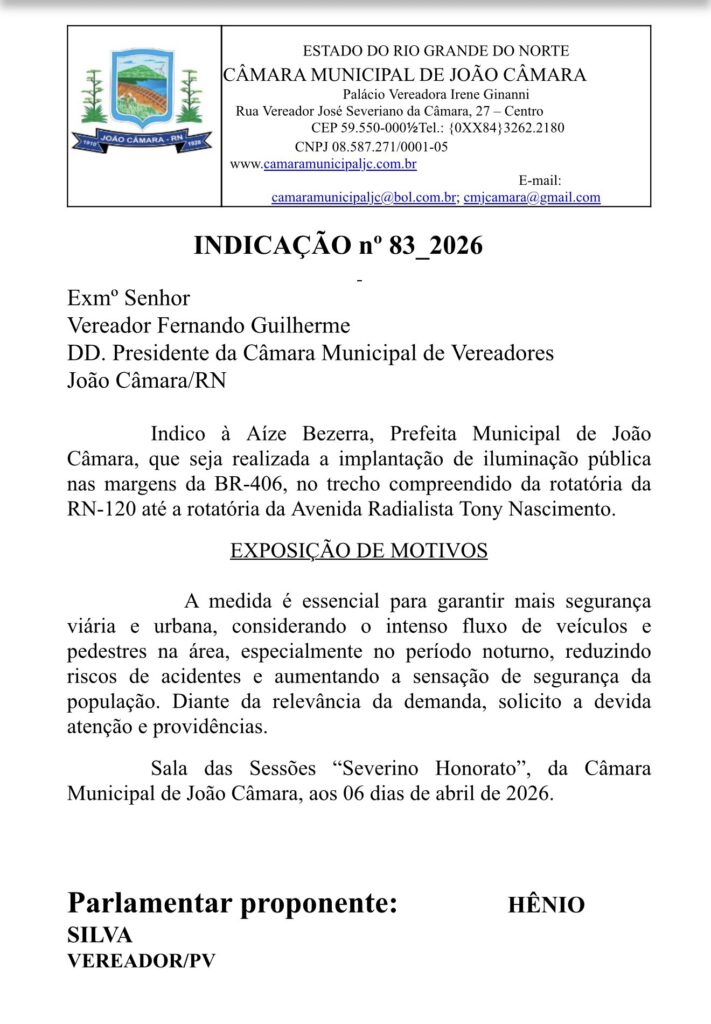 O parlamentar solicitou à prefeita Aíze Bezerra que seja realizada a implantação de iluminação pública nas margens da BR-406, no trecho que compreende a rotatória da RN-120 até a rotatória da Avenida Radialista Tony Nascimento.