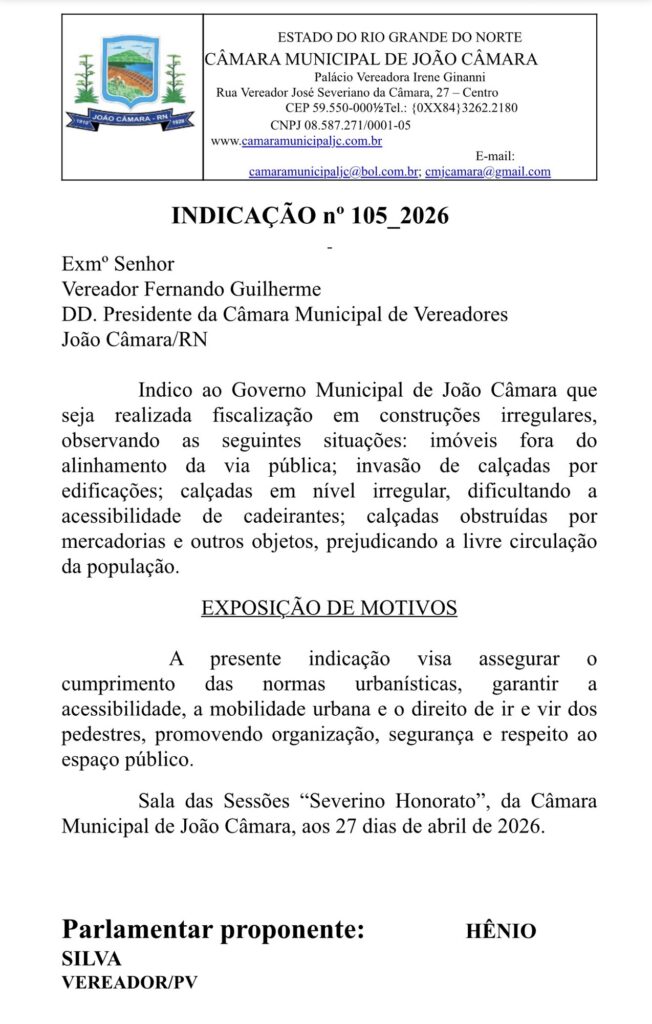 Durante sessão ordinária na Câmara Municipal de João Câmara/RN, o vereador Hênio Silva apresentou uma importante Indicação voltada à organização urbana e ao respeito ao espaço público no município.