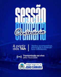 Nesta segunda-feira, (16/03/2026), as 14H acontece mais uma sessão ordinária no plenário da Câmara Municipal de João Câmara, com a participação dos vereadores para debater e deliberar sobre pautas de interesse da população. A sessão é aberta ao público e pode ser acompanhada presencialmente ou pelos...