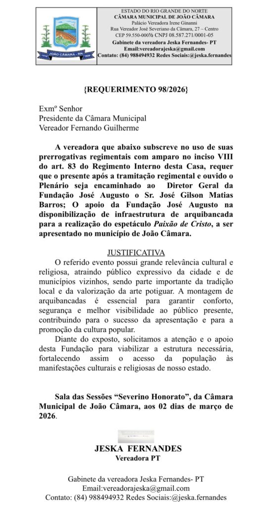 Durante a sessão ordinária realizada na última segunda-feira, 2 de março, na Câmara Municipal de João Câmara, a vereadora Jeska Fernandes (PT) apresentou o requerimento de nº 98/26, solicitando o apoio da Fundação José Augusto para a estruturação do tradicional espetáculo da Paixão de Cristo no município.
